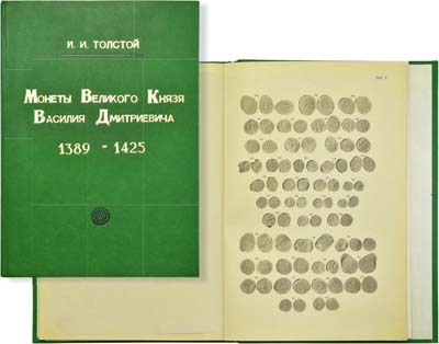 СПБ, 1911 г. 84 стр., V табл. илл. Классическая работа с описанием типов и разновидностей монет, чеканенных во время правления Великого Князя Московского Василия Дмитриевича, сына Дмитрия Донского. Основано на собственной коллекции графа Толстого, а также дополнено коллекцией Великого Князя Георгия Михайловича, Эрмитажа, Исторического музея и И.В. Зубова.