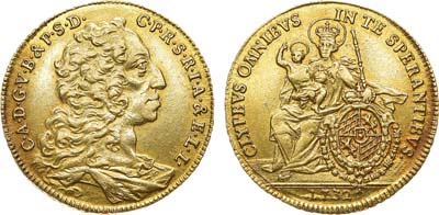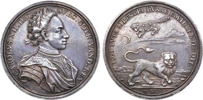 Серебро. 14,83г. Диаметр 35 мм. Нюрнберг. Медальер М. Бруннер (на аверсе в обрезе рукава "МВ"). Аверс: "CAROLVS XII D G - SVEC GOTH VAND REX" поясной портрет короля в военных доспехах вправо. Реверс: Лев, шагающий вправо на фоне пейзажа, над восходящей луной и изображением созвездия Большой Медведицы "POST TVTA SILENTIA LVNAE EMICAT & PRODIT". Hildebrand 169. AU.