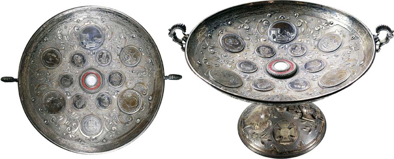 Серебро. 1002,91г. Высота: 160 мм. Диаметр вазы: 230 мм. Диаметр основания: 134 мм. В чашу вазы вмонтированы 10 монет (5 талеров, 4 полуталера, 1/3 талера), 2 настольных медали и эмалевый медальон (аналогичный медальону звезды гессенского ордена Золотого Льва) с изображением герба Гессена и девизом "VIRTUTE ET FIDELITATE" ("За доблесть и верность"). В основание вазы вмонтированы: 1. Гессен-кассельский орден Железного шлема (учреждён курфюрстом Вильгельмом 18 марта 1814 года). 2. Бронзовый знак "За 10 лет службы", вручавшийся от имени курфюрста Вильгельма II (монограмма в центре знака "WK II") в 1834-1849 гг. 3. Гессен-кассельская медаль за кампанию 1814-1815 гг для участников боевых действий против наполеоновских войск (учреждена курфюрстом Вильгельмом 14 марта 1821 года). Гравировка в щитке на основании вазы: герб Гессена и легенда "Hessische Reliquien 1894". Клейма на основании вазы: "W. KAUPERT", "24934", "800, полумесяц и корона". Германия, 1894 год.