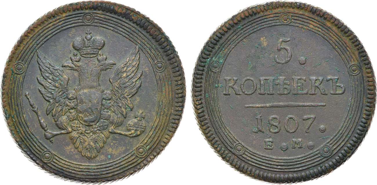 5 копеек 1807 года с орлом образца 1810 года - дна из наиболее редких монет серии 1802-1810 гг.