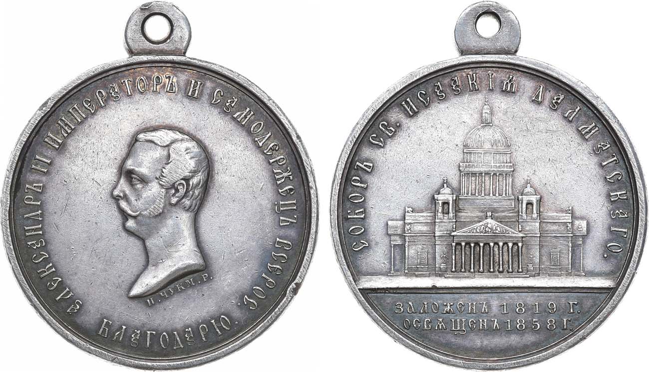 Учреждена в 1858 году. Награждали архитекторов, художников, мастеровых, поставщиков, подрядчиков, членов и чиновников комиссии по строительству собора, а также чинов министерства императорского двора, принимавших участие в строительстве, украшении и освящении Исаакиевского собора. На Санкт- Петербургском монетном дворе в 1858 году отчеканено 86 золотых и 100 серебряных медалей. Носилась на ленте ордена святого Александра Невского. Архитектор Исаакиевского собора О. Монферран был награждён петличной золотой медалью с бриллиантами.