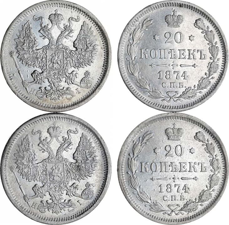 Серебро. 20 копеек 1874 года. СПБ-НI. 3,47 г. Уздеников 1900. Биткин 225. Гурт рубчатый + кресты. AU/UNC. Следы чистки. 20 копеек 1874 года. СПБ-НI. 3,44 г. Уздеников 1900. Биткин 225. Гурт рубчатый + косая насечка. UNC. Следы чистки. AU/UNC.