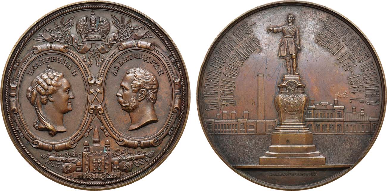 Бронза. 229,63г. Диаметр 80 мм. Санкт-Петербургский монетный двор. Медальер аверса П.А. Мещеряков (на аверсе на 5 часов "М." и на 7 часов "П."), медальер реверса А.Г. Грилихес (на реверсе на 6 часов "АВЕНИРЪ ГРИЛИХЕСЪ РѢЗ."). Смирнов 729. Дьяков 805.1(R1). UNC.