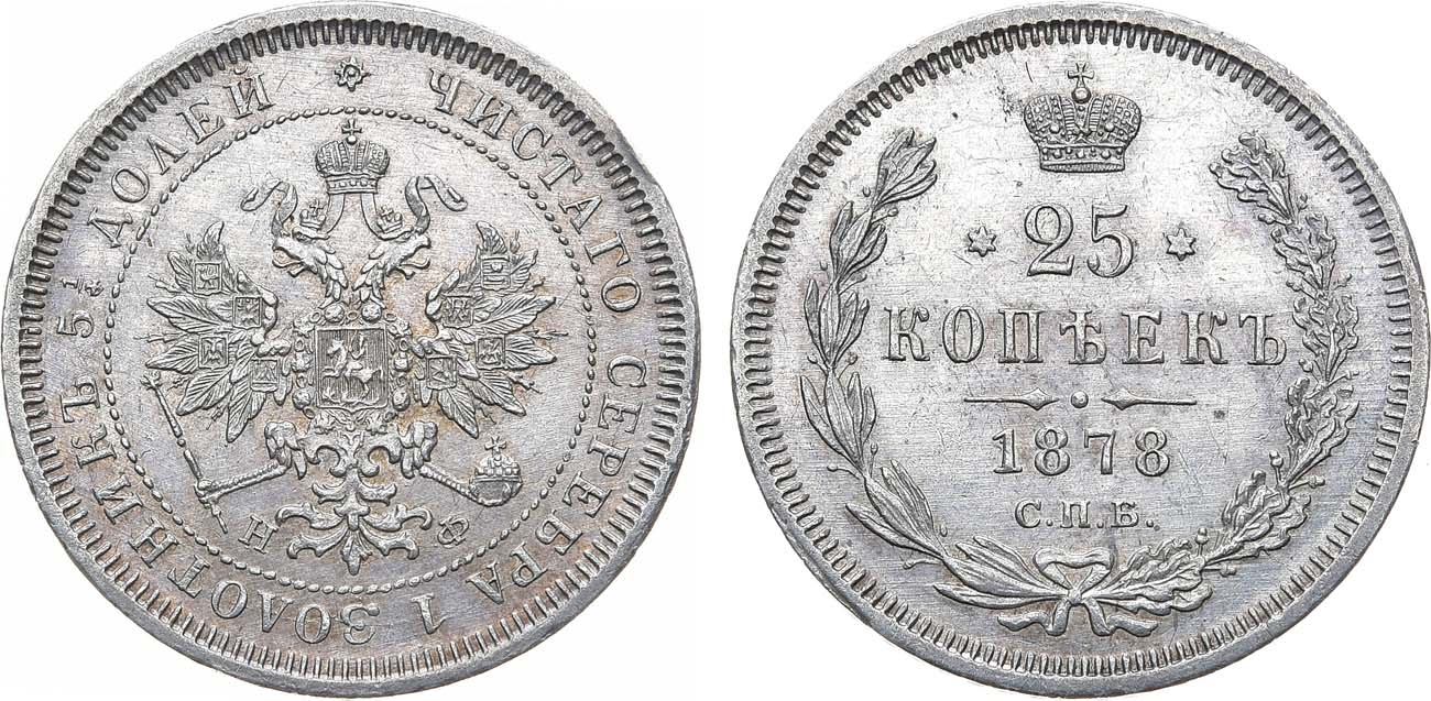 25-копеечники периода правления императора Александра II с ошибками в легенде встречаются особенно редко и представляют высокий коллекционный интерес.
