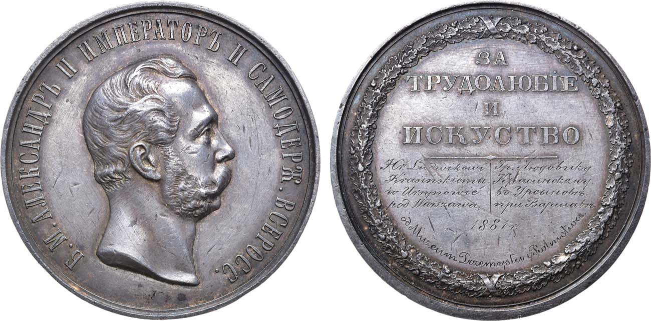 Серебро. 55,71г. Диаметр 50 мм. Санкт-Петербургский монетный двор. Без подписи медальера. Реверс: гравировка на поле под надписью на польском "Hi. Ludwikowi / Krasińskiemu / iv Ursynowie / pod Warszawa" и русском "Гр. Людовику / Красинскому / въ Урсыновѣ / при Варшавѣ" языках в два столбца. Под надписями гравирован год "1881 г.". Под годом внизу по краю медали "od Muzeum Przemyshlu i Rolnictwa". Смирнов 567/б3. Дьяков 642.7(R1). AU.