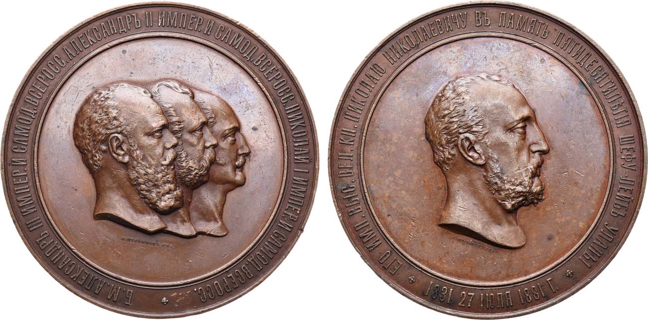 Бронза. 316,64г. Диаметр 89,7 мм. Санкт-Петербургский монетный двор. Медальер Л.Х. Штейнман (аверс — под изображениями на фоне: "Л.ШТЕЙНМАНЪ РѢЗ."; реверс — под изображением на фоне: "Л.ШТЕЙНМАНЪ РѢЗ."). Смирнов 890. Дьяков 923.1(R1). AU/UNC.