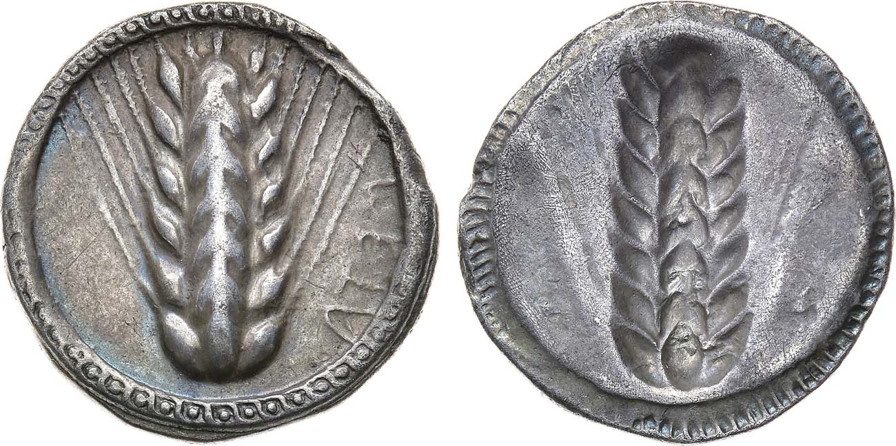 Серебро. 7,87г. Метапонт. Аверс: изображение колоса; легенда "ATEM". Реверс: вдавленный рельеф. AU.
