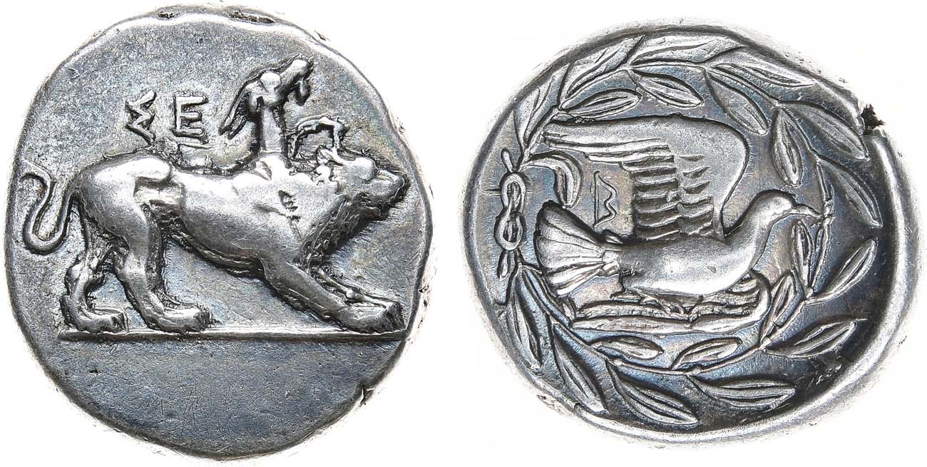 Серебро. 12,08г. Сикион. Аверс: крадущаяся вправо химера; монограмма "ΣΕ" на поле. Реверс: изображение летящего вправо голубя внутри оливкового венка; монограмма "В" на поле. VF.