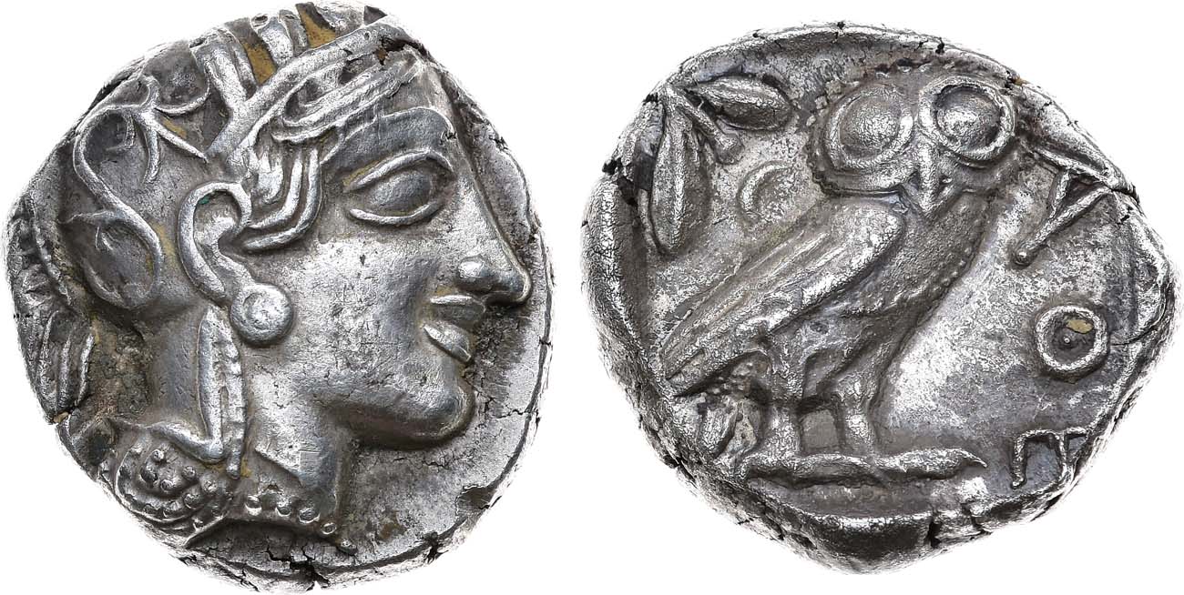 Серебро. 17,13г. Аверс: изображение головы Афины в шлеме. Реверс: "АΘЕ"; изображения совы, оливковой ветви и полумесяца. AU.
