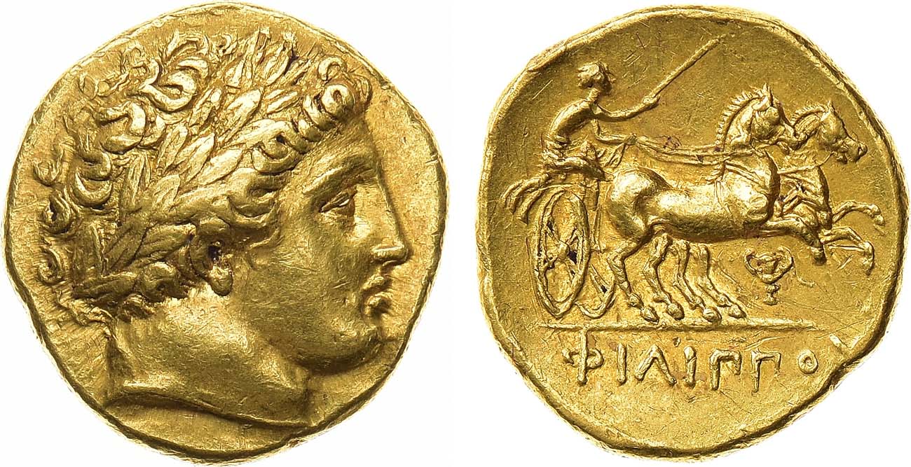 Золото. 8,57г. Пелла. Аверс: изображение головы бога Аполлона в венке вправо. Реверс: изображение биги вправо; строчная легенда "ФIΛIППOY". AU.