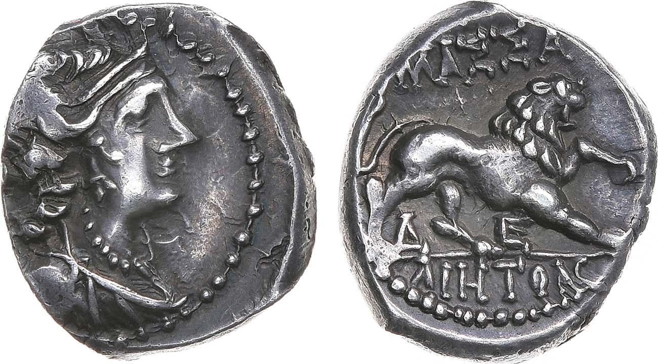 Серебро. 2,72г. Массалия. Аверс: портрет Артемиды вправо. Реверс: легенда "MAΣΣA / ΛIHTΩN"; изображение льва вправо, под ним литеры "Δ E". AU.