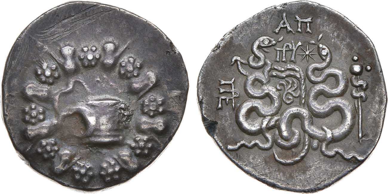 Серебро. 11,57г. Реверс: изображение двух переплетённых змей. BMC 98. AU.