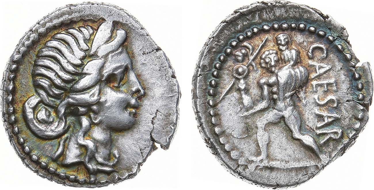 Серебро. 3,94г. Передвижной военный монетный двор в Северной Африке. Аверс: изображение головы богини Венеры в диадеме вправо. Реверс: изображение Энея с Анхисом и Палладой на руках; вертикальная легенда "CAESAR". XF+.