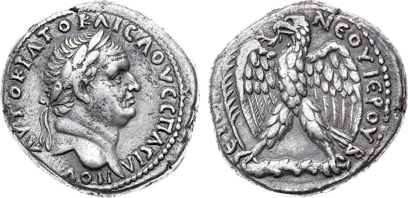 Серебро. 14,44г. Антиохия-на-Оронте. Аверс: портрет Веспасиана в лавровом венке вправо; круговая легенда "ΑVΤΟΚΡΑTO ΚΑΙΣΑ Ο VΕΣΠΑΣΙΑΝΟV". Реверс: изображение орла с расправленными крыльями - влево; слева от него пальмовая ветвь; круговая легенда "ΕΤΟΥΣ ΝΕΟΥ ΙΕΡΟΥ". XF.
