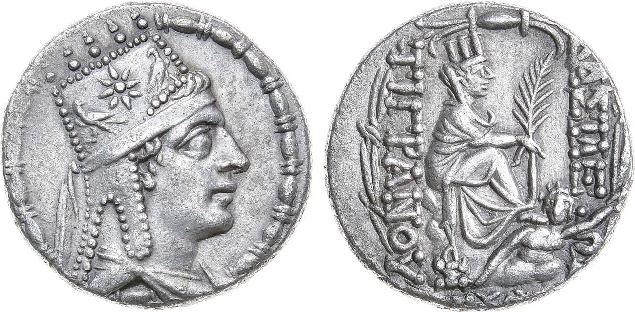 Серебро. 15,54г. Тигранокерт. Аверс: портрет Тиграна II в диадеме, украшенной звездой между двумя орлами. Реверс: легенда "BAΣIΛEΩ-Σ / TIΓPANOY"; изображение богини Тихе, сидящей на камне с лавровой ветвью в руке; внизу - изображение речного бога Оронта, плывущего вправо; внизу монограмма. AU.