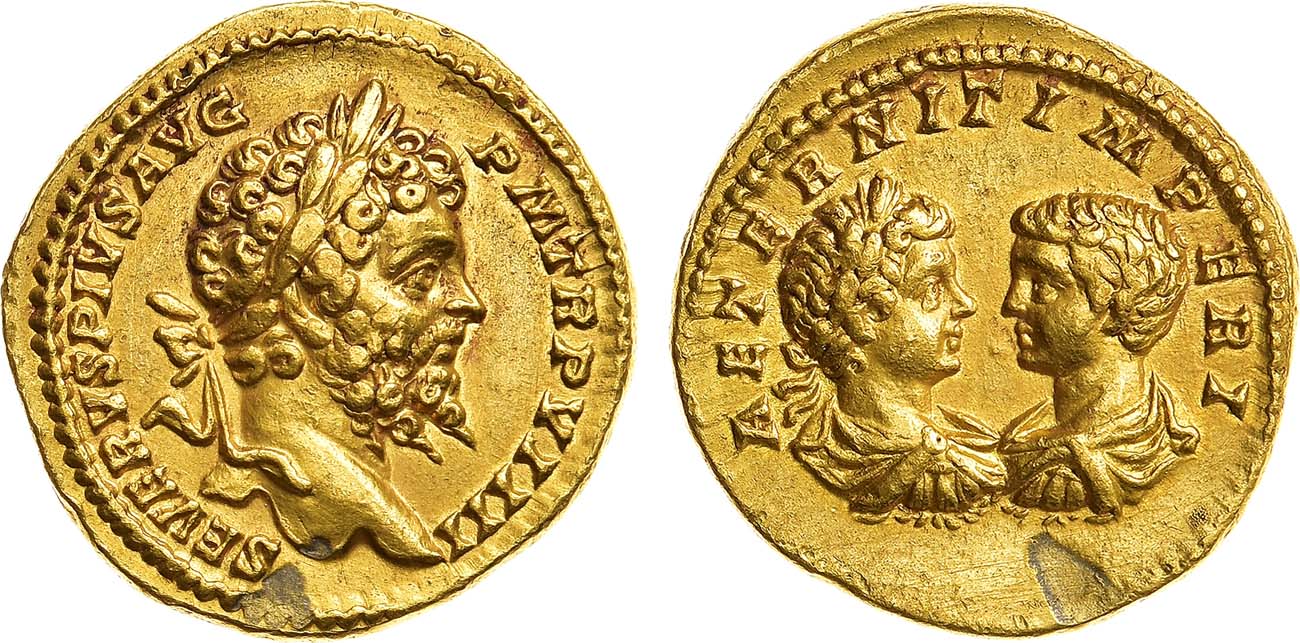 Золото. 7,25г. Рим. Аверс: круговая легенда "SEVERVS PIVS AVG - PM TRPVIIII"; портрет императора в лавровом венке вправо. Реверс: круговая легенда "AETERNITIMPERI"; портреты Каракаллы и Геты. Calico 2602(R2). AU.