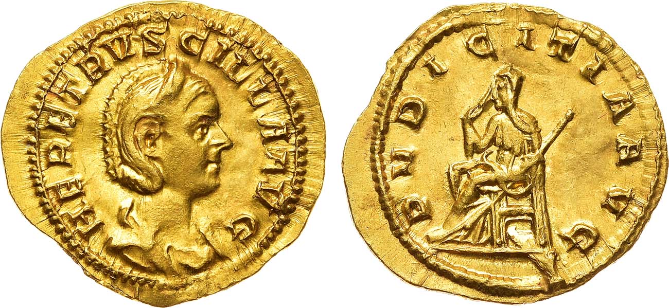 Золото. 3,72г. Рим. Аверс: круговая легенда "HER ETRVSCILLA AVG"; изображение Этрусциллы вправо. Реверс: круговая легенда "PVDICITIA AVG"; изображение Пудиции (богини стыдливости и целомудрия) на троне - влево. Sear 9489. RIC 59a. Hanter 9 var. UNC.