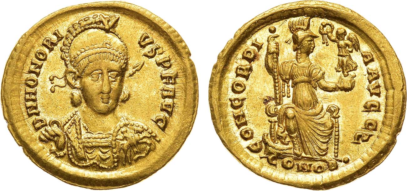 Золото. 4,46г. Константинополь. Аверс: круговая легенда "DN HONORIVS PF AVG"; изображение императора в военных доспехах. Реверс: круговая легенда "CONCORDIA AVGG S"; изображение персонификации Константинополя на троне; со скипетром в правой руке и богиней Никой - в левой; под линией обреза "CONOB". Sear 20901. AU/UNC.