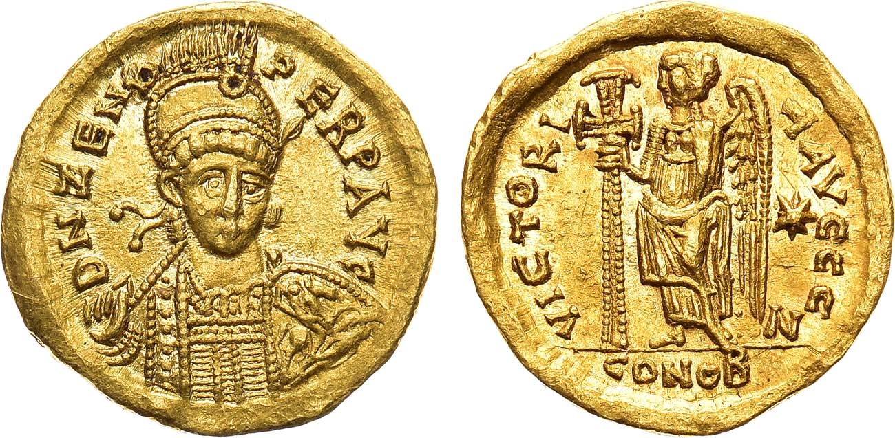 Золото. 4,42г. Константинополь. Аверс: изображение императора анфас в военных доспехах с копьём; круговая легенда "DN ZENO PERP AVC". Реверс: изображение богини победы Виктории, держащей Крест; справа на поле звезда; под линией обреза "CONOB"; круговая легенда "VICTORIA AVCCCN". Sear 21517. AU/UNC.