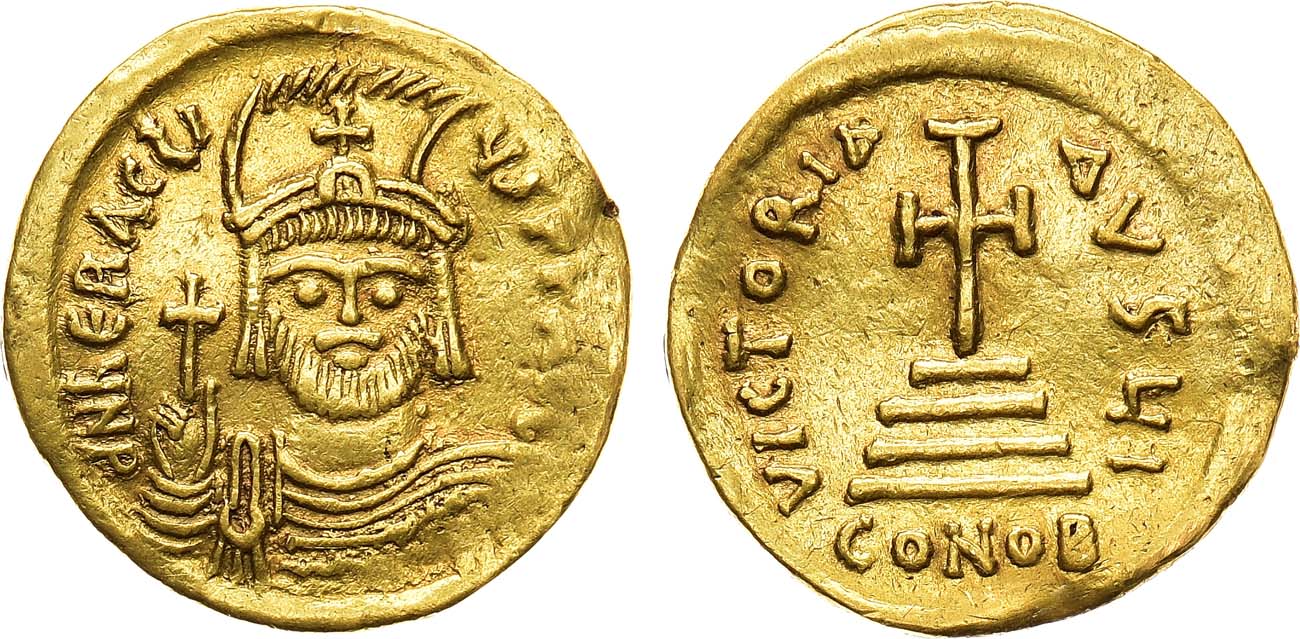 Золото. 4,44г. Константинополь. Аверс: портрет императора анфас с короткой бородой, в шлеме с оперением; с крестом в правой руке; круговая легенда "d N hЄRAC-LIЧS PP AVG". Реверс: изображение Креста на алтаре из 3 ступеней; легенда "VICTORIA AVϚЧ I"; внизу "CONOB". Sear 730. XF+/AU.