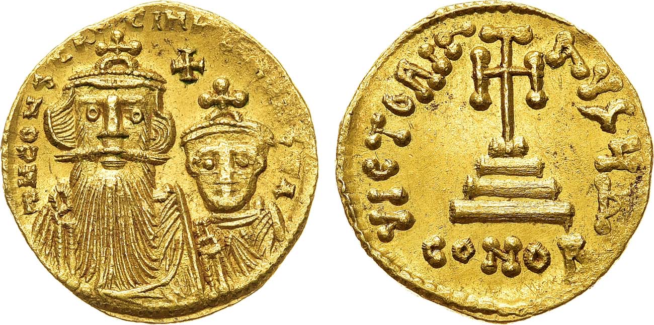 Золото. 4,46г. Константинополь. Аверс: круговая легенда, портрет Константина II с длинной бородой, портрет Константина IV, крест между головами. Реверс: "VICTORIA-AVГЧГ", внизу "CONOB". Sommer 12.18, Sear 959. AU.