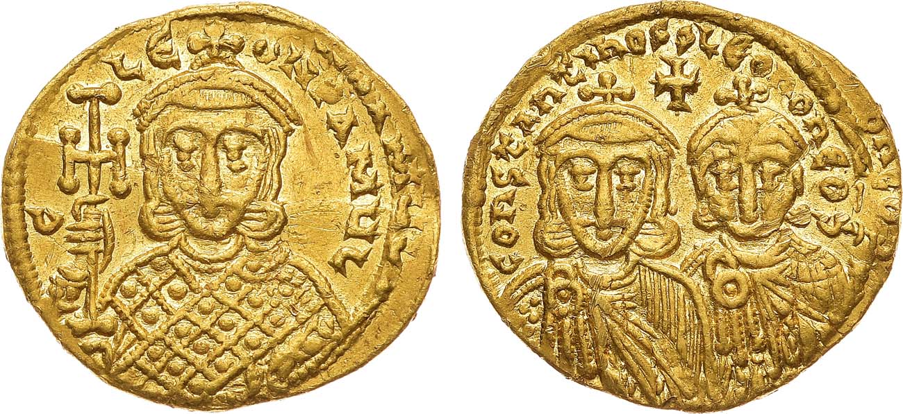 Золото. 4,44г. Константинополь. Аверс: погрудные изображения императора Константина V и его сына Льва в коронах, хламидах, с фибулами на правом плече; между их головами - на поле крест. Реверс: погрудное изображение императора Льва III в короне c крестом; с крестом в правой руке. Sear 1551. Sommer 23.2.2. AU.