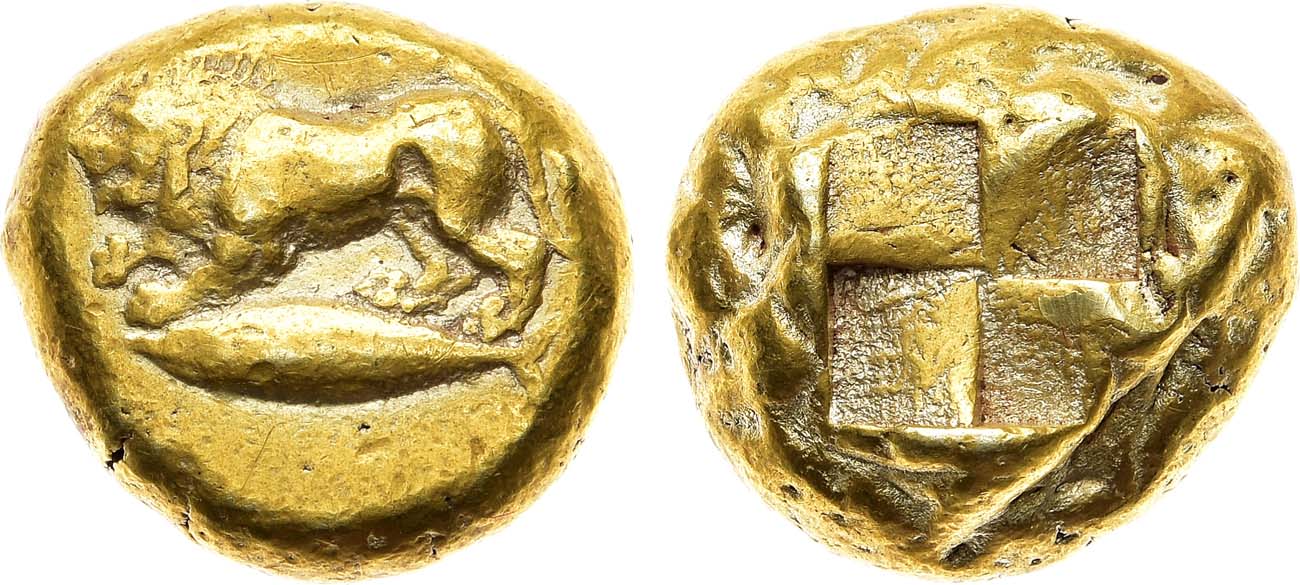 Электр. 16,06г. Аверс: изображение идущего льва и тунца под ним - влево. Реверс: четырёхчастный вдавленный квадрат. XF.