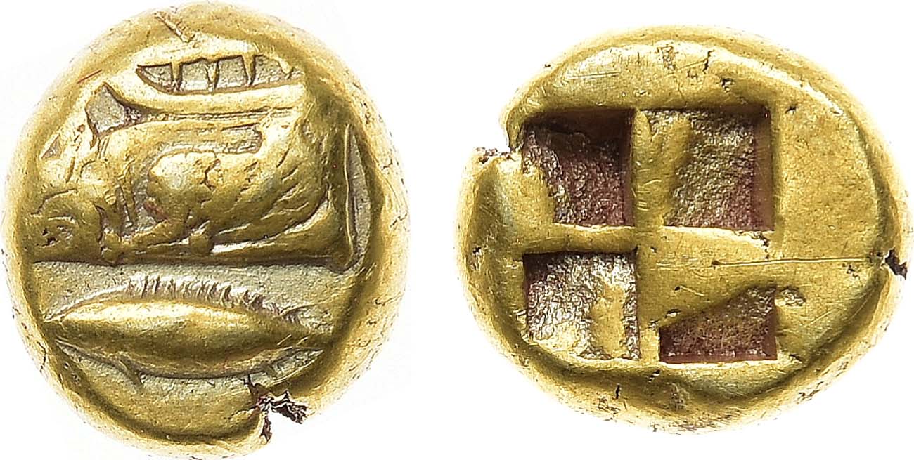 Электр. 2,64г. Кизик. Аверс: изображение носовой части галеры и тунца. Реверс: четырёхчастный вдавленный квадрат. AU.