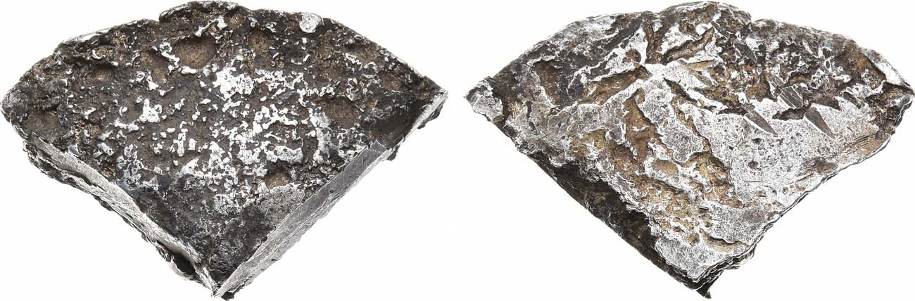 Серебро. 60,51г. Размеры: 50,95х34,22 мм. Высота 10,21 мм. Длины прямых сторон: 36,16 и 34,87 мм. Следы проковки. На двух боковых поверхностях имеются следы разруба в два удара с последующим сломом. Изготовлен в XI - XII вв. AU.