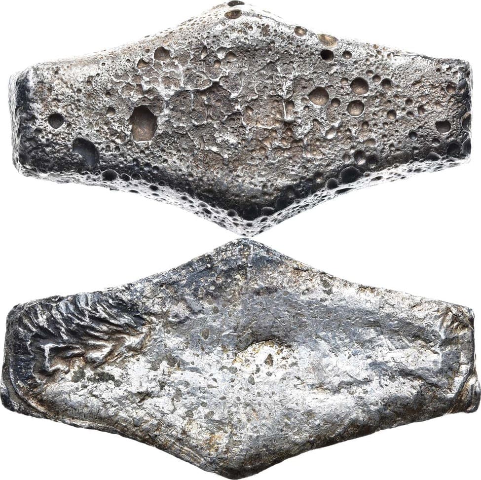 Серебро. 164,77г. Длина: 77,95 мм. Ширина: 39,67 мм (центр), 18,55 мм (левый край), 17,72 мм (правый край). Высота: 10,89 мм. Прокопов 4. AU.