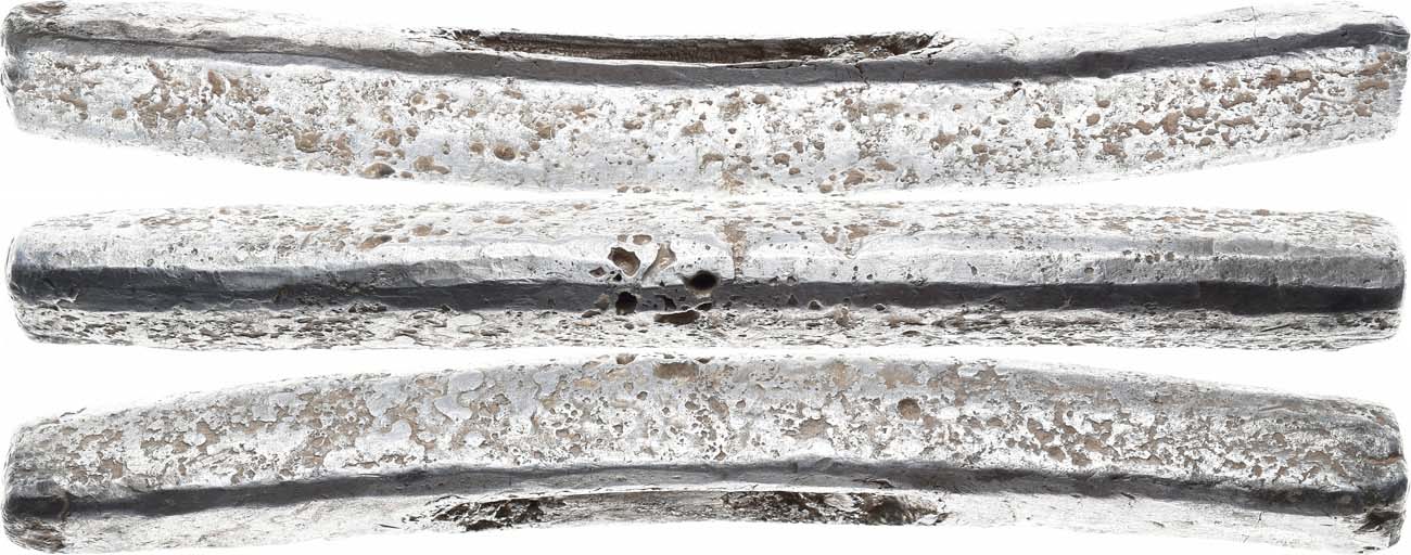 Серебро. 196,3г. Длина: 132,1 мм. Ширина: 12,72 мм (левый край), 13,75 мм (правый край), 14,39 мм (центр). Высота: 15,35 мм. Сверху слитка имеется характерная усадочная ложбинка. На верхней плоскости с краю нанесена насечка. Отсутствие на боковой поверхности шва свидетельствует об отливке в один прием. Прокопов 26. AU.