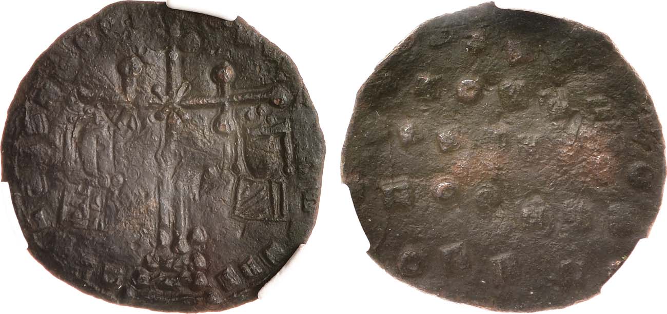 Медь. Аверс: подражание милиарисиям Василия II и Константина VIII. Реверс: подражание строчной легенде в виде квадратиков. ГП2 52C (R-VI). XF 45.