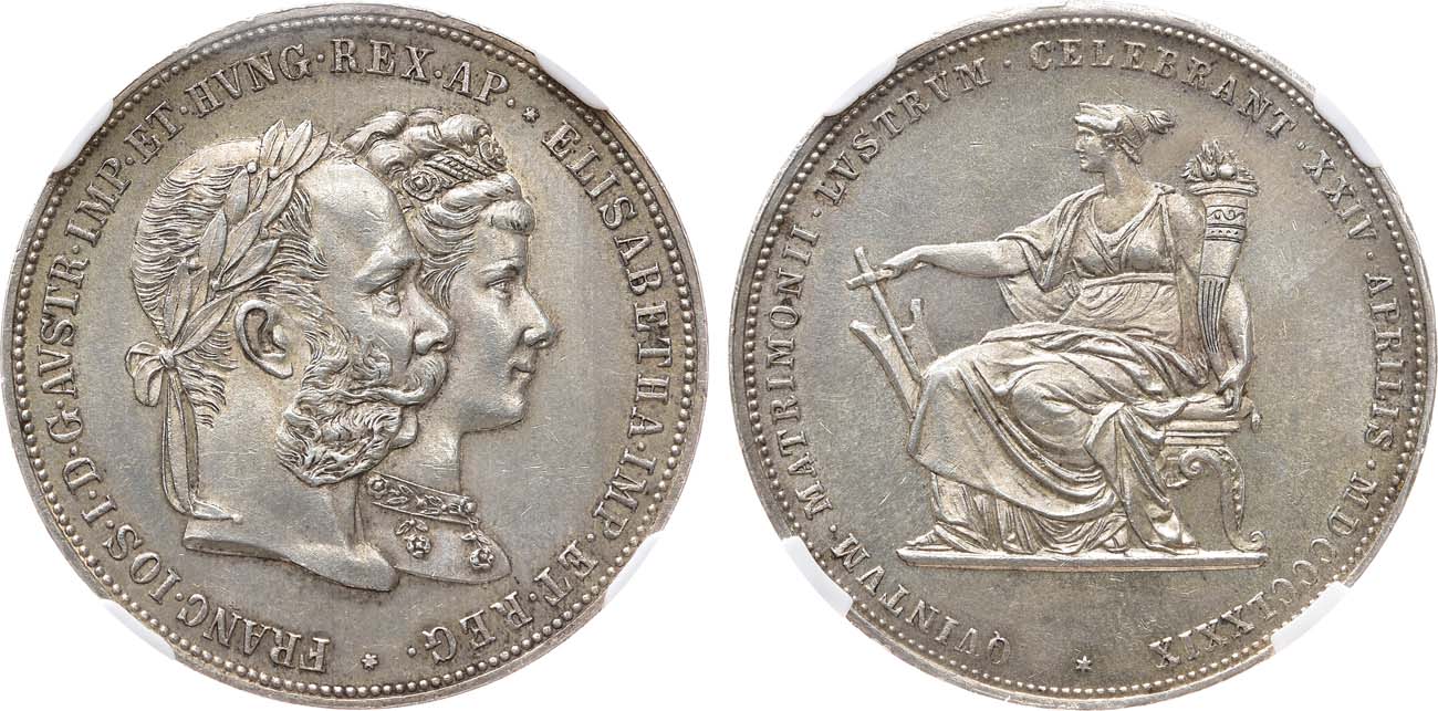 Серебро. Вена. Отчеканена в память годовщины серебряной свадьбы Франца Иосифа I и Елизаветы. Тираж 275.000 экз. KM X M5. MS 63.
