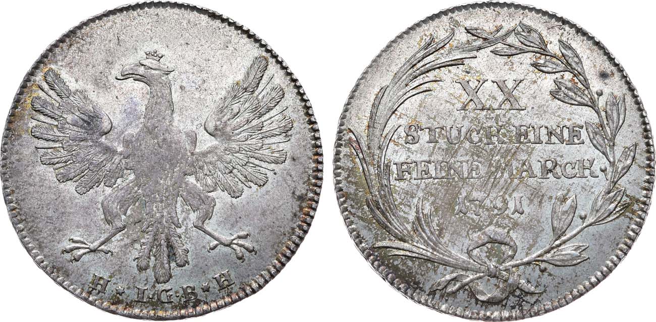 Серебро. 14,04г. Франкфурт-на-Майне. (H*I•G•B*H). KM 280. J./F. 938. Sch. 104. AU.