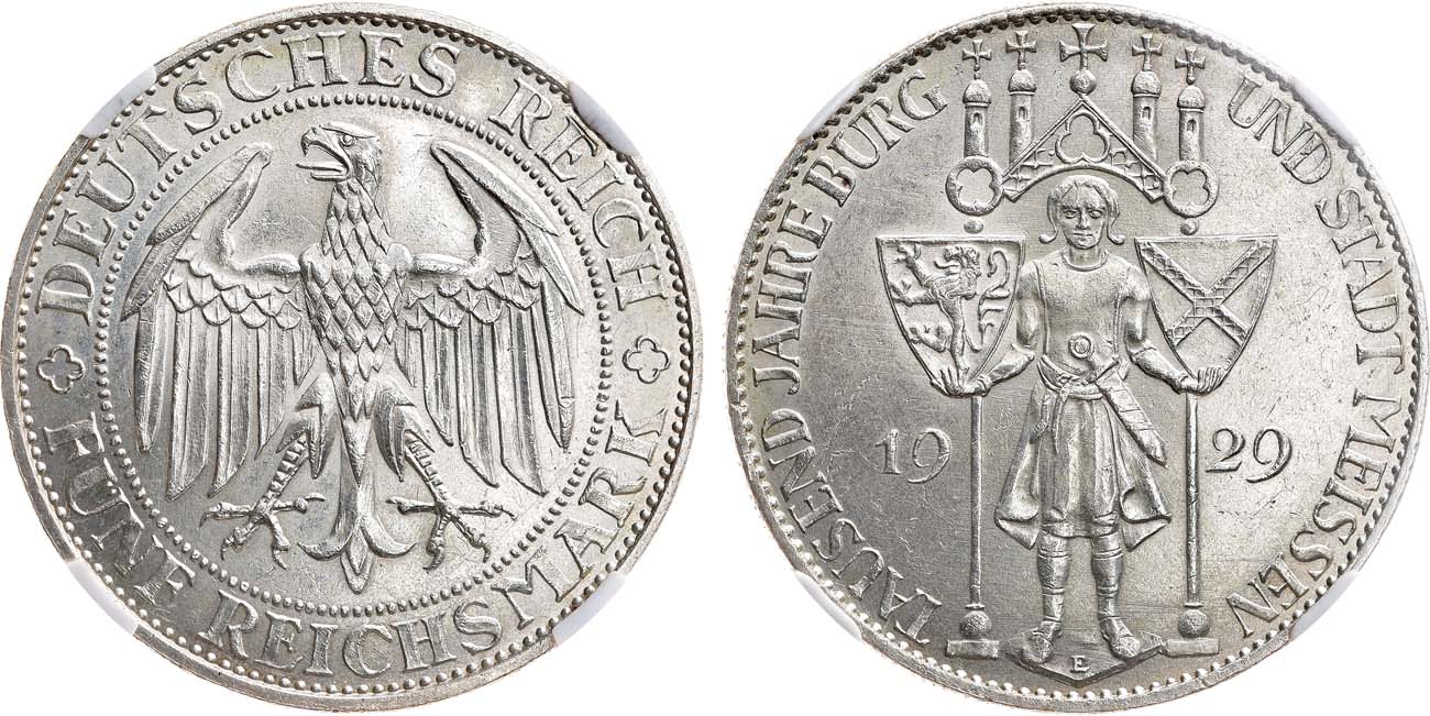 Серебро. Мюльденхуттен (Е). Отчеканена в честь 1000-летия основания города Мейсена. KM 66. Jaeger 339. Weege 40. MS 63.