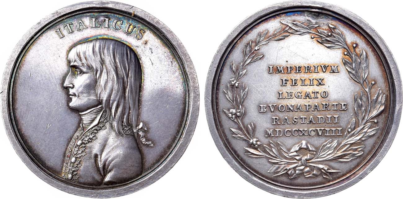 Серебро. 24,75г. Диаметр 40 мм. Италия. Без подписи медальера. Аверс: поясной портрет Наполеона влево. Реверс: текст в 6 строк в лавровом венке "IMPERIVM / FELIX / LEGATO / BVONAPARTE / RASTADII / MDCCXCVIII". Julius 663. Essling 770. AU/UNC.