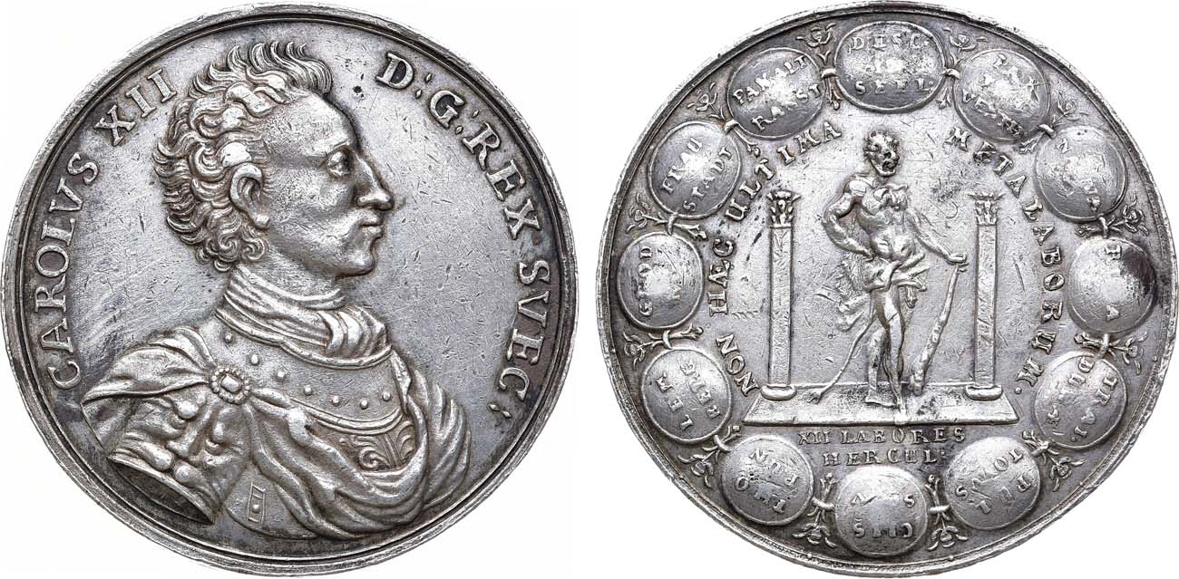 Серебро. 36,17г. Диаметр 44 мм. Без подписи медальера. Аверс: "CAROLVS XII D G REX SVEC" поясной портрет короля в военных доспехах вправо. Реверс: "NON NAEC ULTIMA METALABORUM" король в львиной шкуре на пьедестале, вокруг венок из названий покорённых городов, внизу под линией обреза "XII LABORES HERCUL.". AU.