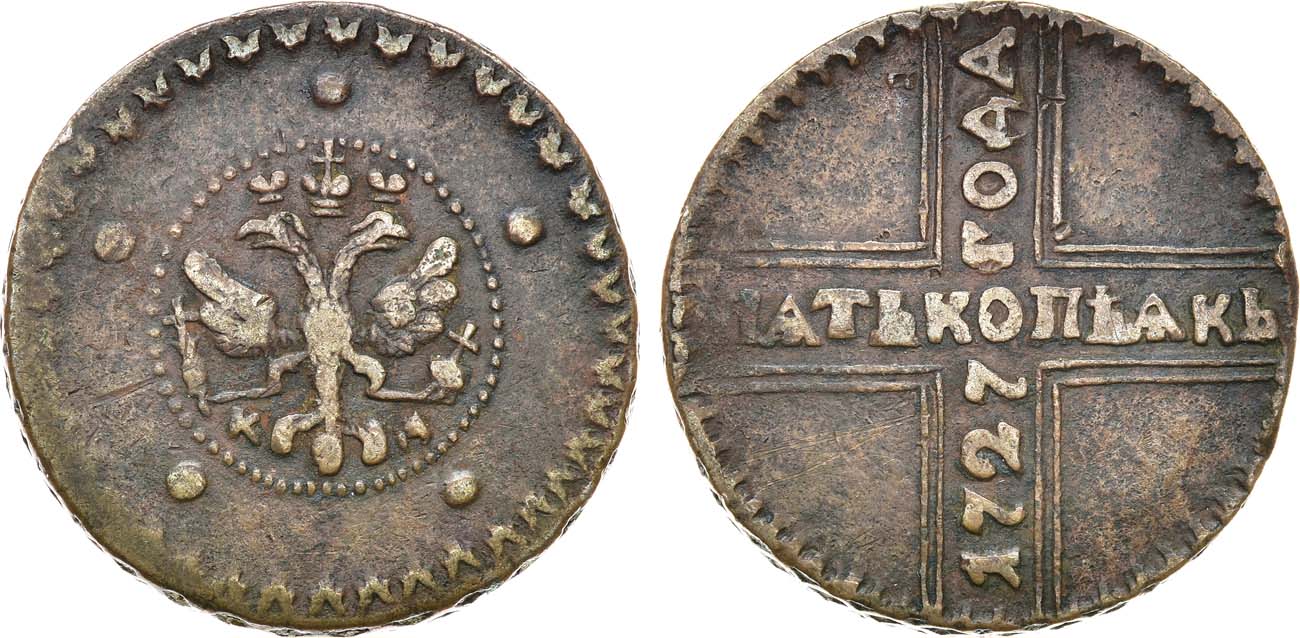 Медь. 18,74г. Красный монетный двор. Аверс: в хвосте орла 3 пера, малые короны без крестов, точки большие вокруг орла. Уздеников 2463. Биткин 294. Дьяков 86, 31. Brekke 53, 29. XF.