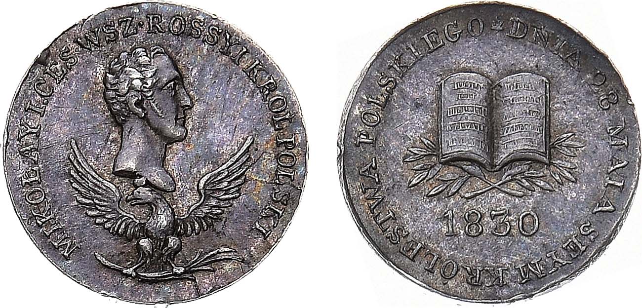 Серебро. 1,9г. Диаметр 11 мм. Варшавский монетный двор. Без подписи медальера. Hutten-Czapski 3639. AU 58.