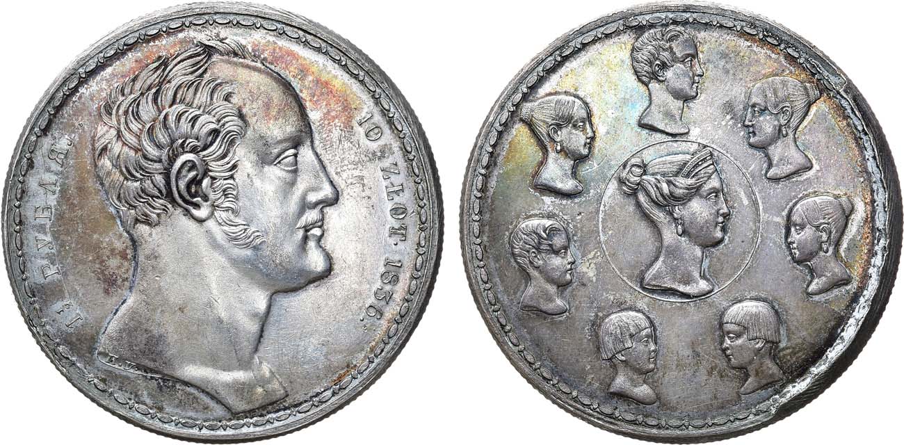 «...По отчеканке 50 штук рант выкрошился и пришлось делать новые штемпеля. …Вместе с тем повелено чеканить эту монету лишь по особому каждый раз высочайшему повелению. Новые штемпеля отличались от предыдущих лишь сокращением фамилии медальера на лицевой стороне: «П.У.» вместо «Р.П.УТКИНЪ.». В течение 1836 г. новым штемпелем отчеканили еще 50 штук; затем по столько же в 1837 г. для раздачи значительным лицам и в 1838 г. С тех пор и еще до недавнего времени чеканили иногда эту монету, несмотря на то, что уже в 1847 г. штемпеля были сильно повреждены. Хотя монеты и были ценою в 1 1/2 рубля, но уже в 1835 г. получили название фамильных или семейных рублей — название, удержавшееся за ними и до ныне.» (Винклер П. фон. Фамильный рубль (1835–1836). Из истории монетного дела в России. СПб., 1897. С. 173–179). Относится к группе наиболее редких и востребованных монет Российской Империи.