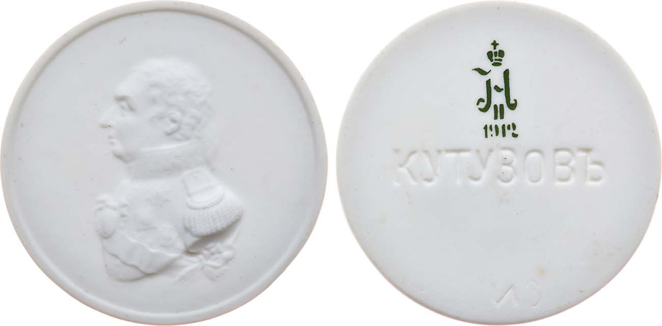Фарфор. 29,37г. Диаметр 57 мм. Санкт-Петербург, Императорский фарфоровый завод (на реверсе марка по бисквиту "вензель Николая II / 1912", на шесть часов инициалы формовщика в массе "ИЗ"). Медальер (скульптор) Фёдор Петрович Толстой (без подписи). UNC.