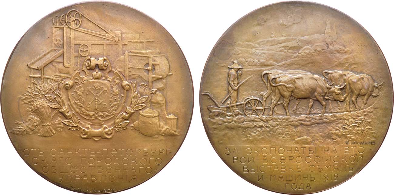 Бронза. 102,67г. Диаметр 64 мм. Санкт-Петербург. Мастерская Жакара (на аверсе внизу "ГР . A. ЖАКАРЪ (Гравировал А. Жакар)). Медальер Е. Малышев (на реверсе справа, над линией обреза "Е . МАЛЫШЕВЪ"). Дьяков 1538.1(R2). MS 62.