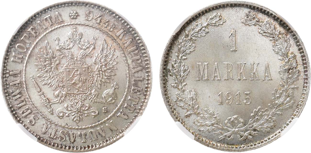 Серебро. Для Финляндии. Гельсингфорсский монетный двор. Уздеников 4824. Биткин 401. Казаков 489. MS 66.