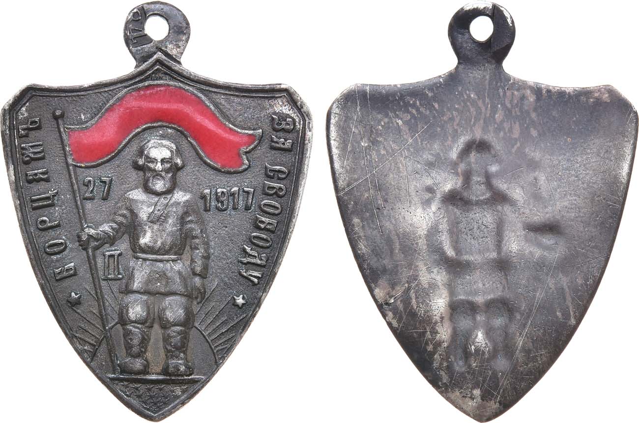 Серебро, эмаль. 4,37г. Размер: 35,5х26,2 мм. Россия. Неизвестная мастерская. Имитационное пробирное клеймо на ушке - "84". Аверс: крестьянин на фоне зари держит красное революционной знамя. Реверс: контррельеф. Руденко 1917.24.1(R3). AU.