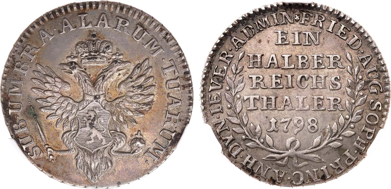 Серебро. Монетный двор в Зильберхютте. Монета чеканена в княжестве Йевер по специальному разрешению Павла I, имевшего титул князя Йеверского. Уздеников 4924(∸). Биткин 2(R1). AU 55.