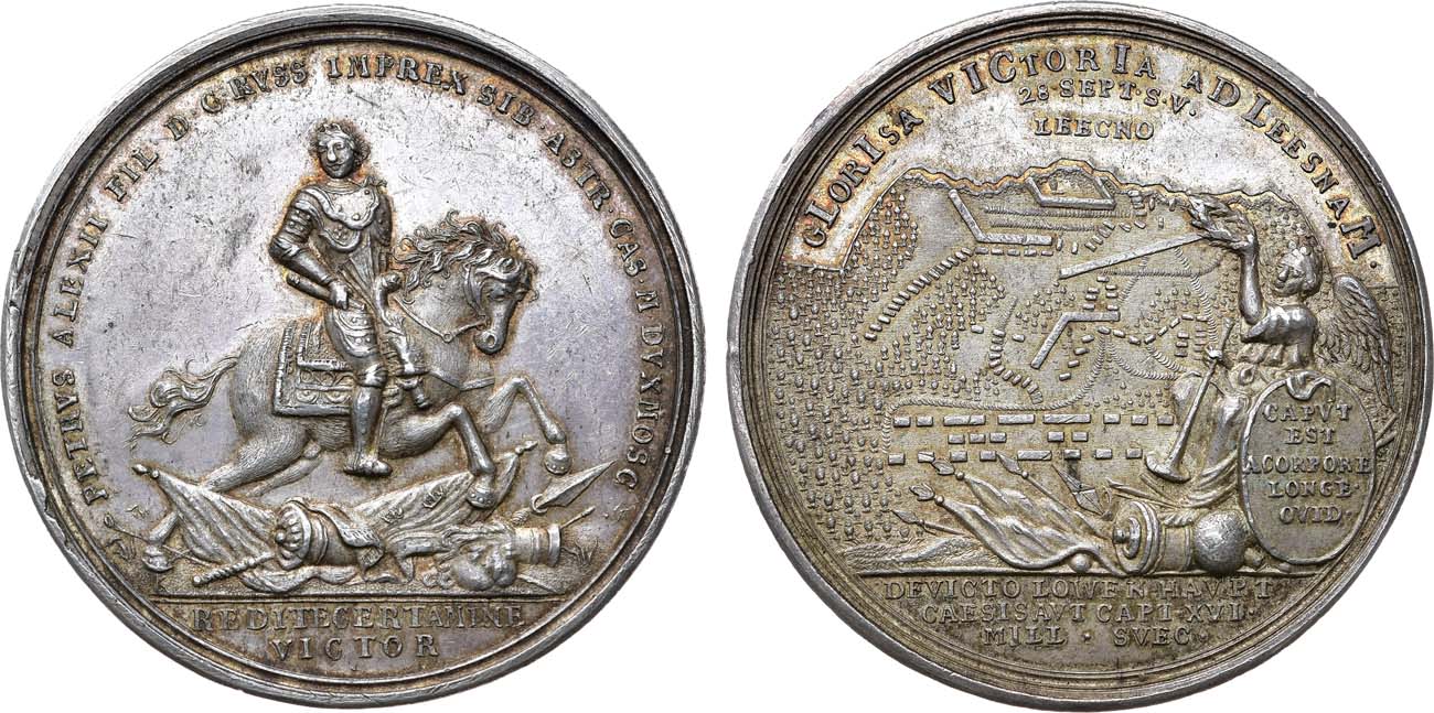 Серебро. 51,14г. Диаметр 46,6 мм. Санкт-Петербургский монетный двор. Из серии медалей на события Северной войны. Аверс: медальер Иоганн Кеттель (слева над обрезом: "К"), копия штемпеля Ф.Г. Мюллера. Смирнов 177/б. Iversen XXIII.6.б. Соколов#084.б.К(R2). Дьяков 25.11(R2). AU/UNC.
