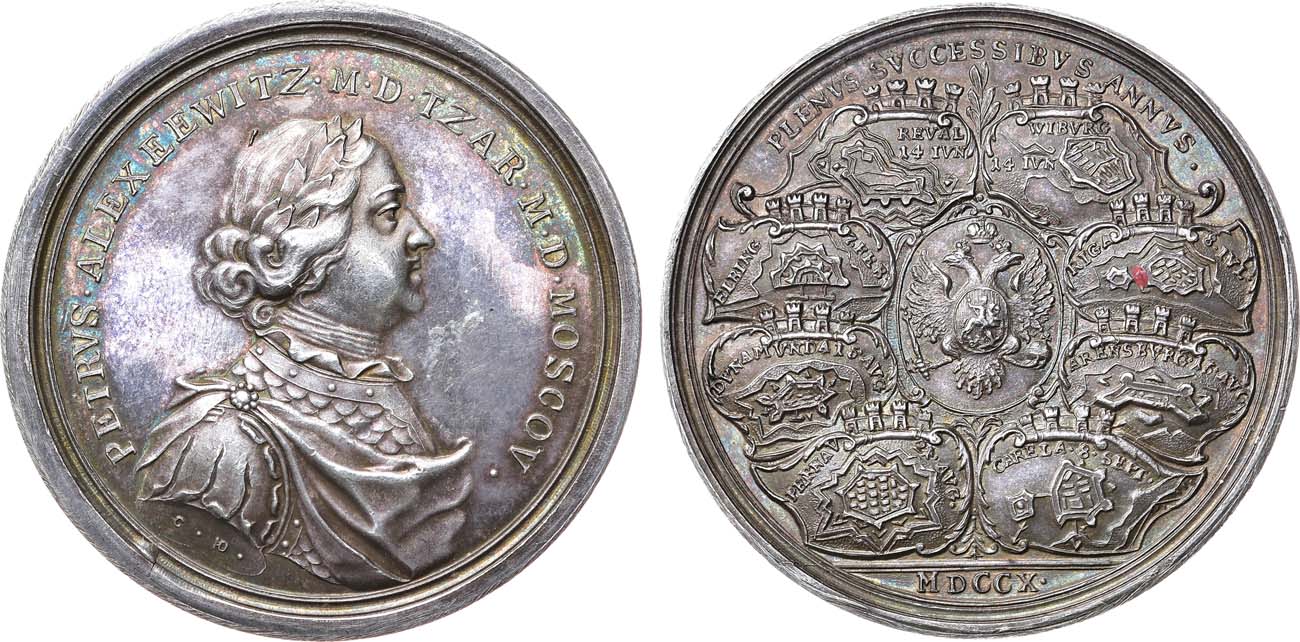 Серебро. 50,15г. Диаметр 46,5 мм. Санкт-Петербургский монетный двор. Из серии медалей на события северной войны. Медальер С. Юдин (на аверсе в обрезе рукава "С•Ю•"), копия штемпеля Ф.Г. Мюллера. Дьяков 39.7(R1). MS 62.