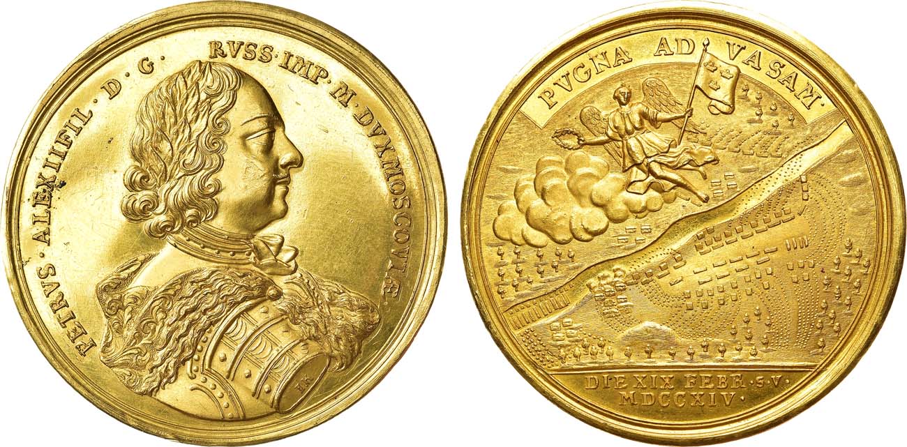 Сражение у деревни Напо, близ города Ваза, на западном побережье современной Финляндии, состоялось 19 февраля (2 марта) 1714 г. Русская армия под командованием князя М.М. Голицына в результате ряда успешных манёвров и фланговых атак конницы смогла окружить и разбить шведскую армию генерала К.Г. Армфельдта. Победа в битве имела важное стратегическое значение в ходе Северной войны – Россия фактически стала контролировала всю территорию Финляндию и начала готовить плацдарм для продвижения вглубь Швеции. С аукциона Kuenker 271, Оснабрюк, февраль 2016 года, лот 716. На аукционе была с заключением ГИМ за подписью А.С. Шкурко.