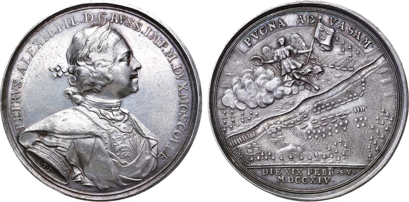 Сражение у деревни Напо, близ города Ваза, на западном побережье современной Финляндии, состоялось 19 февраля (2 марта) 1714 г. Русская армия под командованием князя М.М. Голицына в результате ряда успешных манёвров и фланговых атак конницы смогла окружить и разбить шведскую армию генерала К.Г. Армфельдта. Победа в битве имела важное стратегическое значение в ходе Северной войны – Россия фактически стала контролировала всю территорию Финляндию и начала готовить плацдарм для продвижения вглубь Швеции. С аукциона Kuenker 234, Оснабрюк, июнь 2013 года, лот 6027.