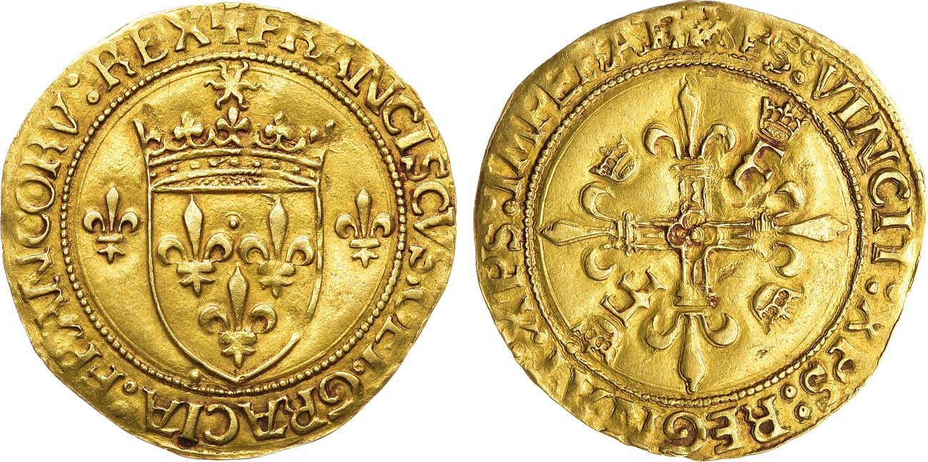 Золото. 3,37г. Париж. Аверс: изображение герба Франции между двумя лилиями; круговая легенда "+ FRANCISCVS: DEI: GRACIA: FRANCORV: REX". Реверс: изображение креста с лилиями и коронами; круговая легенда "+ XPS: VINCIT XPS: REGNAT: XPS: IMPERAT". AU.